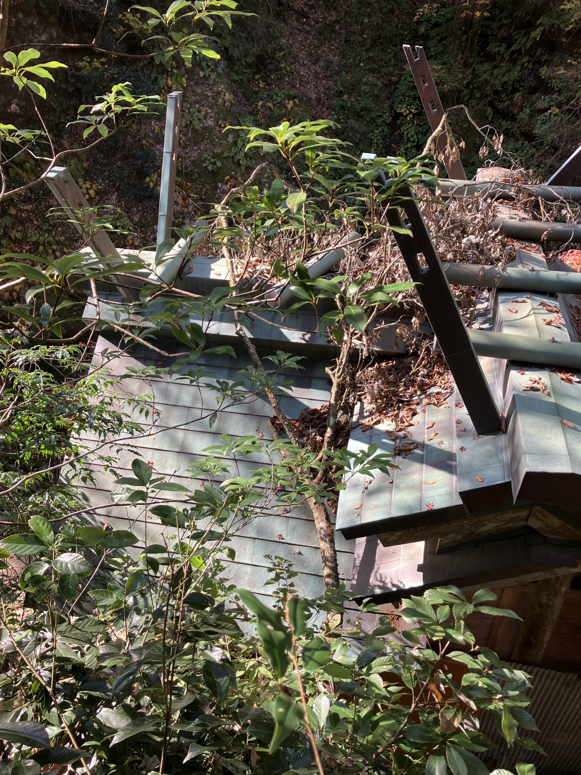 福知山市大江町にて神社本殿に倒れた倒木の撤去作業を行いました。Before After 急傾斜地での作業でしたが無事作業完了