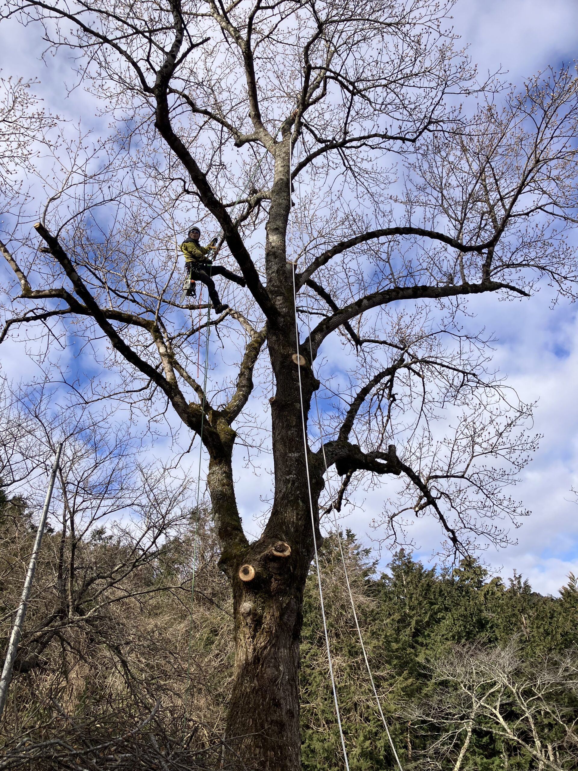 与謝野町にて墓地に支障のあるカシノキ伐採のご依頼を頂きました。後ろに墓地、前に畑と小屋があり急傾斜地に立っています。伐倒するスペースが無い為リギングにて特殊伐採を行いました。根本付近から二股になってお
