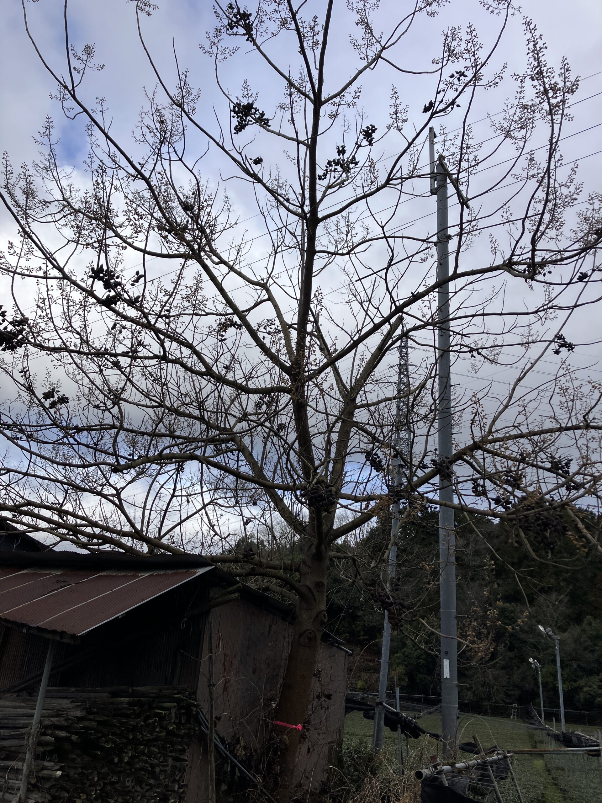 綾部市にて胡桃の木伐採のご依頼を頂きました。倉庫と電柱と茶畑に挟まれた胡桃の木の伐採です。作業完了