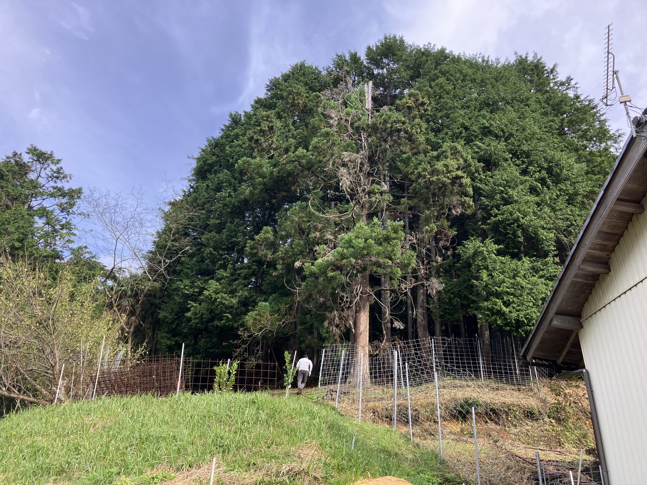 福知山市にて落雷にあった杉の伐採と田んぼに影響を及ぼす樹木の伐採を行いました。