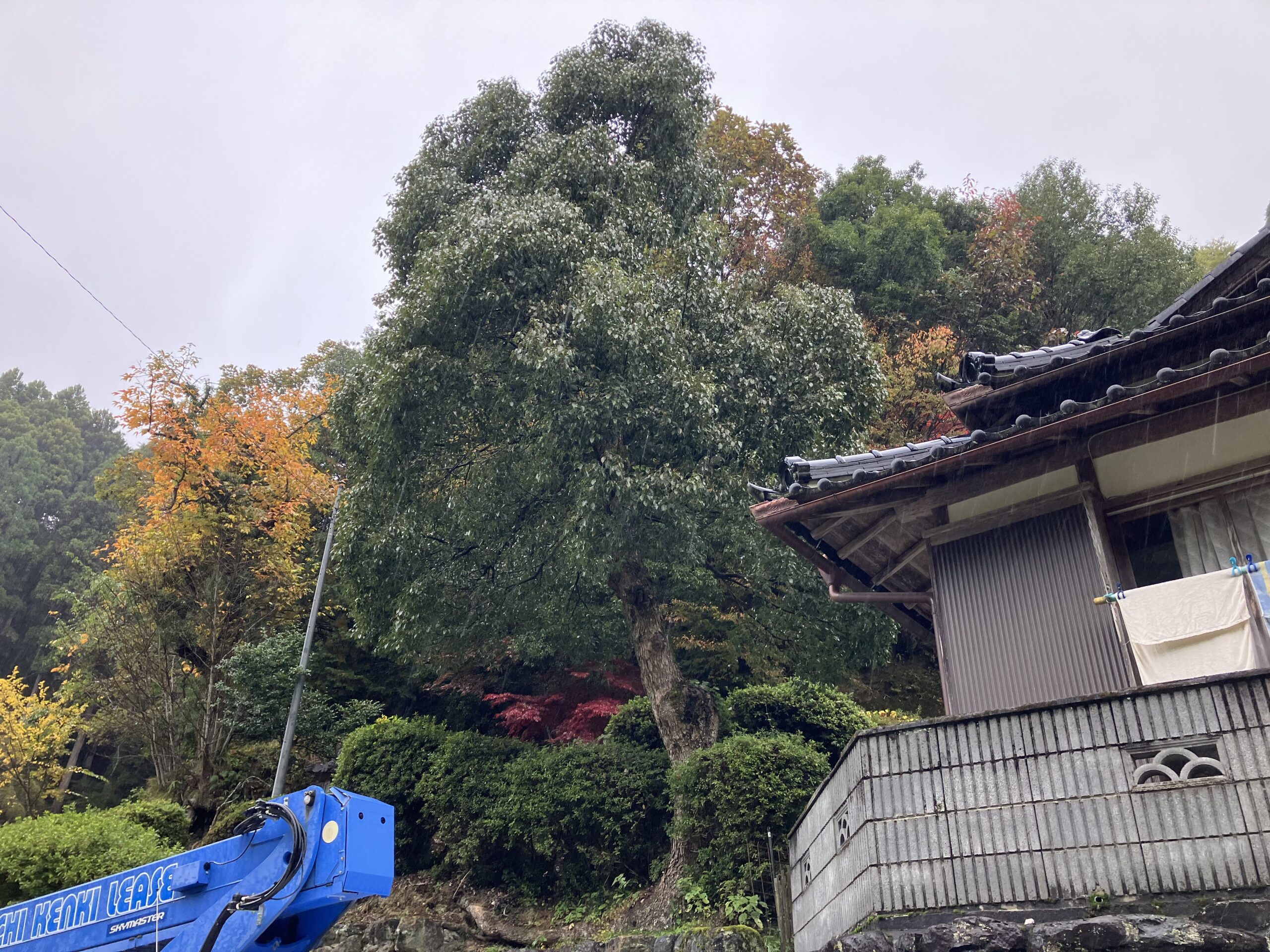 福知山市大江町にて住宅横の楠木を伐採しました。高所作業車を使用しての伐採作業です。徐々に伐り詰めて作業完了です。