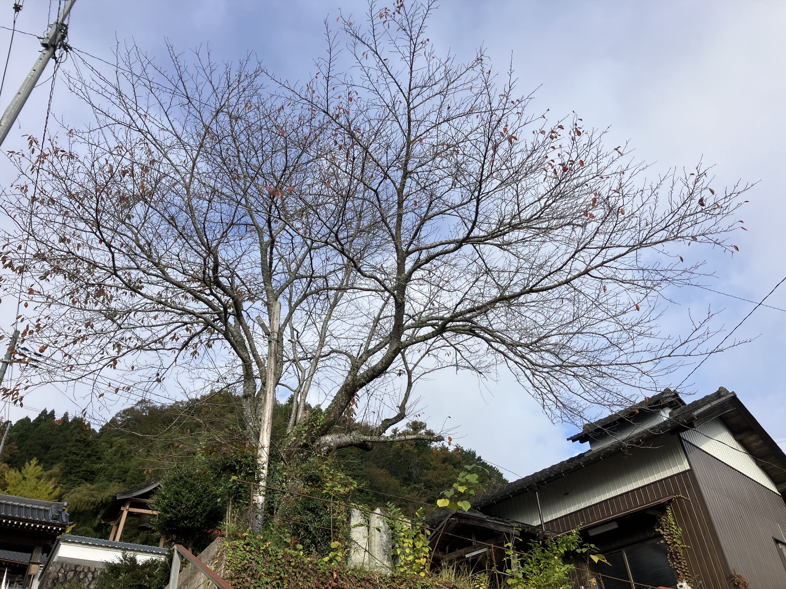 福知山市にて桜の枝落としを行いました。Before 三方を電線に囲まれています。リギングで特殊伐採を行いました。 無事作業終了です。After